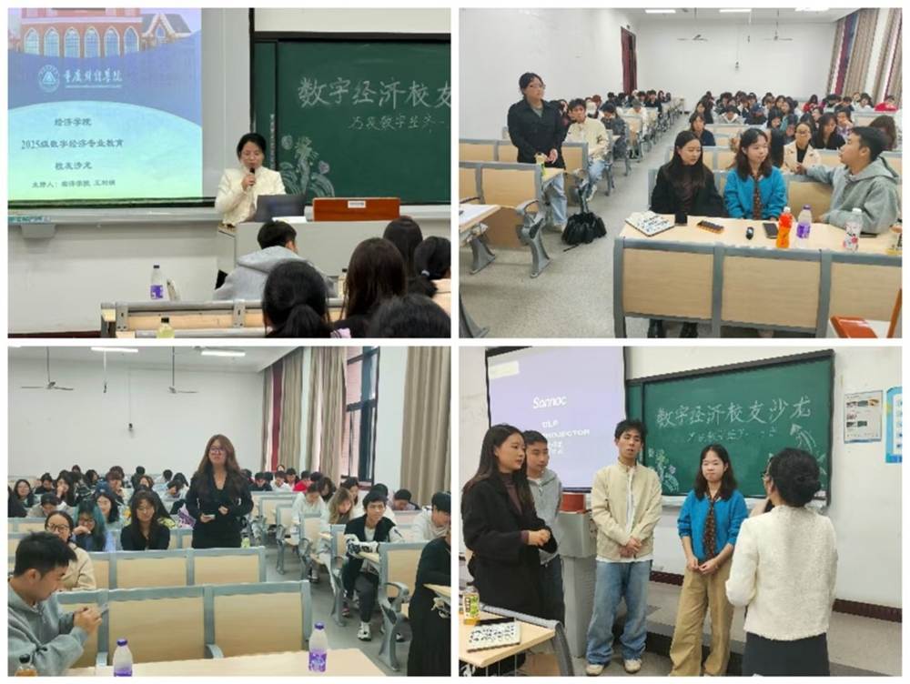 2025年11月1日下午,我院数字经济专业2025级新生专业认知教育系列活动之校友沙龙在教学楼1306教室顺利举行。本次活动旨在帮助2025级普通本科与专升本新生尽快适应大学学习生活,增强专业认同,明晰职业发展方向。沙龙由经济统计系教师王利娟组织并主持,数字经济专业教师刘云飞、李梨,2025届辅导员左小容老师,以及全体2025级数字经济专业本科新生和专升本新生共同参与。活动采用线上线下融合模式,共吸引278名师生参加,现场气氛热烈,交流深入。
