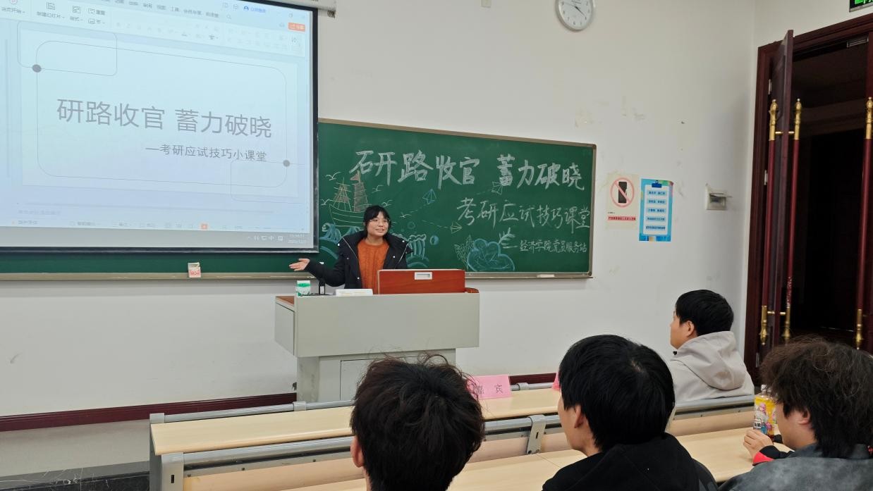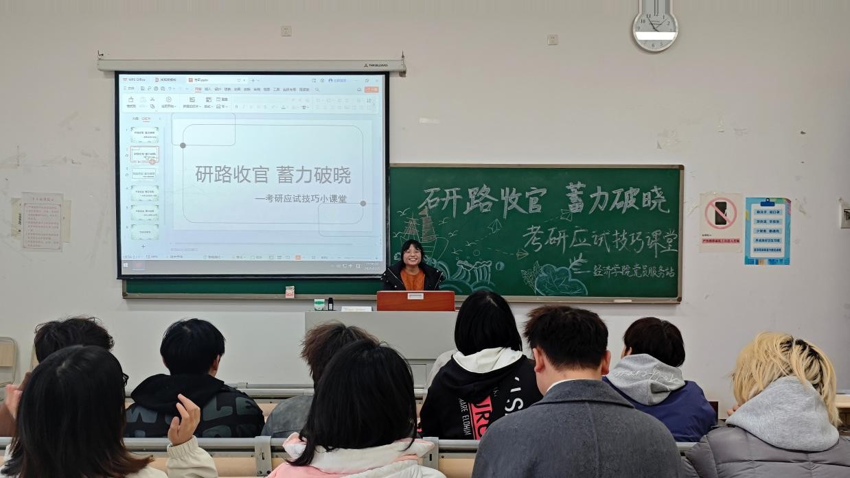 为精准破解考研备考难点,掌握科学备考策略、增强应试信心,并营造积极向上的学习氛围。12月5日,经济学院党员服务站于1403教室开展了“研路收官,蓄力破晓”考研应试技巧小课堂,由经济统计系李贤凤老师担任主讲,为同学们带来系统而实用的备考指导。