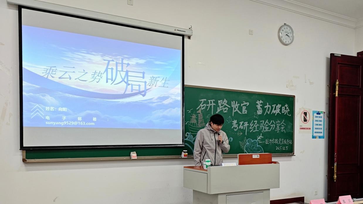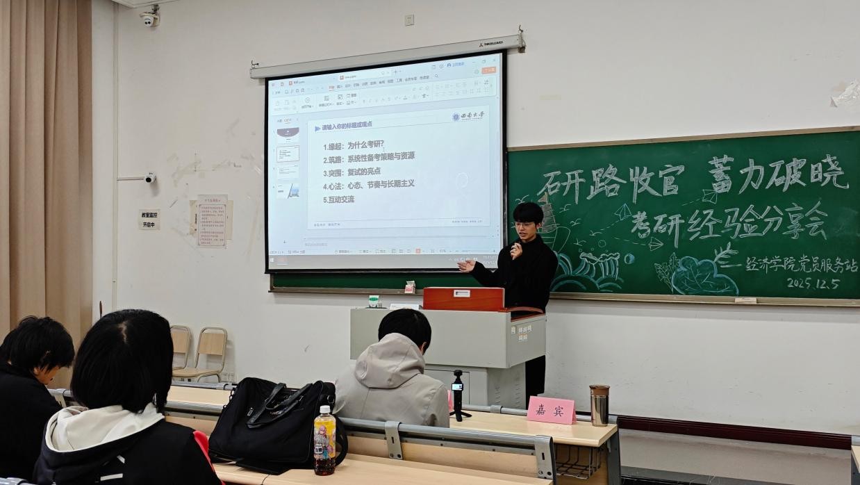 为充分发挥优秀学子的榜样引领作用,营造浓厚的考研学习氛围,帮助经济学院的同学们明晰考研方向、掌握高效备考策略。2025年12月5日,经济学院党员服务站在1403教室成功举办了“‘研’路收官,蓄力破晓”考研经验分享会。