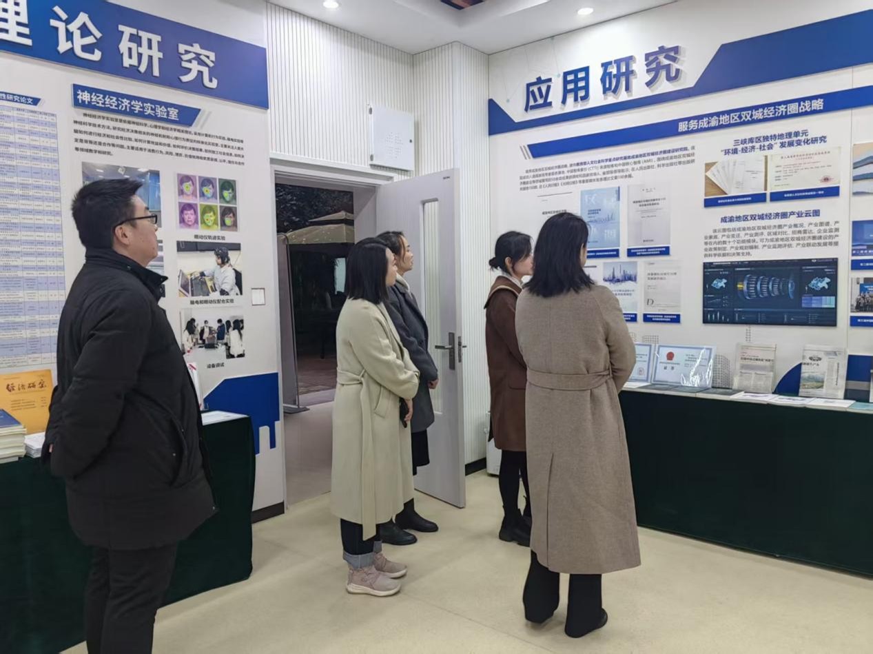 调研伊始,在林黎主任的陪同下,宋院长一行人参观了重庆工商大学经济学院学科规划布局与成果展厅。展览以图文、数据及实物相结合的形式,系统展示了该院在学科建设、科研创新、人才培养及社会服务等方面取得的系列成果。