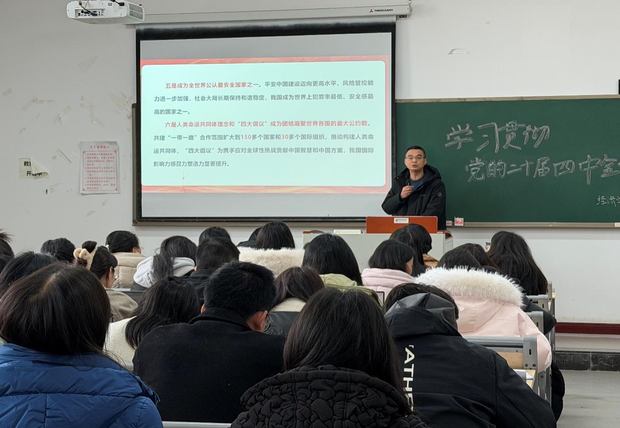 按照市委教育工委统一部署及学校党委工作安排,学校学习贯彻党的二十届四中全会精神宣讲工作持续深入推进。1月6日下午,副校长崔中山在1507教室为院党总支和通识教育学院党总支全体党员及教职工作专题宣讲报告。