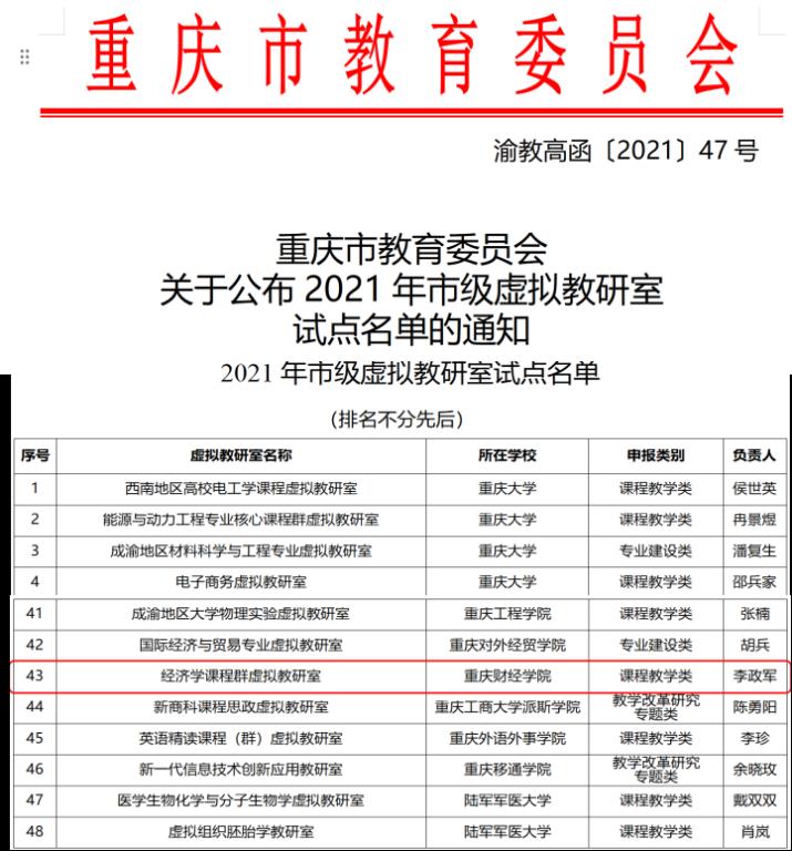 为推动新一代信息技术和教育教学深度融合,探索基层教学组织新形态,2018年我校聘请南京师范大学李政军教授组建了西方经济学教学团队,开始虚拟教研室的实际运行工作。在2020年疫情期间,以经济学教学团队位基础,整合校内外经济学课程教师资源,成立了经济学基础课程群虚拟教研室,并于获评2021年重庆市试点虚拟教研室建设名单,2021年入选重庆市优秀基层教学组织典型案例。